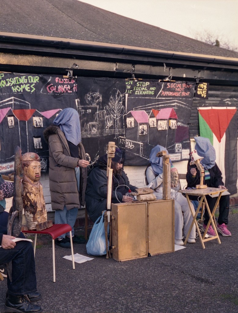 It is this sharing of stories that binds the work together and allows connections to form. Some of the more recent characters carry layered histories, built from stories shared by people involved in the housing campaign. Through this process, the puppets came to feel like a form of social glue, holding the work in place forming something like a collective dream. The actual performance took place in the park as we were locked out of the bowls club where it was due to take place. Although the final performance was difficult the whole experience was good and hopefully we can do something like it again. Information about previous performance here.