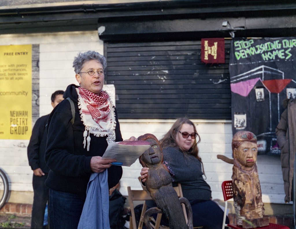 The Big Bad Wolf —a picture of local government bending over backwards to act in the interests of landlords and property developers — was seen skulking in Stratford Park in the late afternoon winter light. This formed our Christmas Talking Sculpture performance, made with the Focus E15 Housing Campaign for our final meeting of 2025.