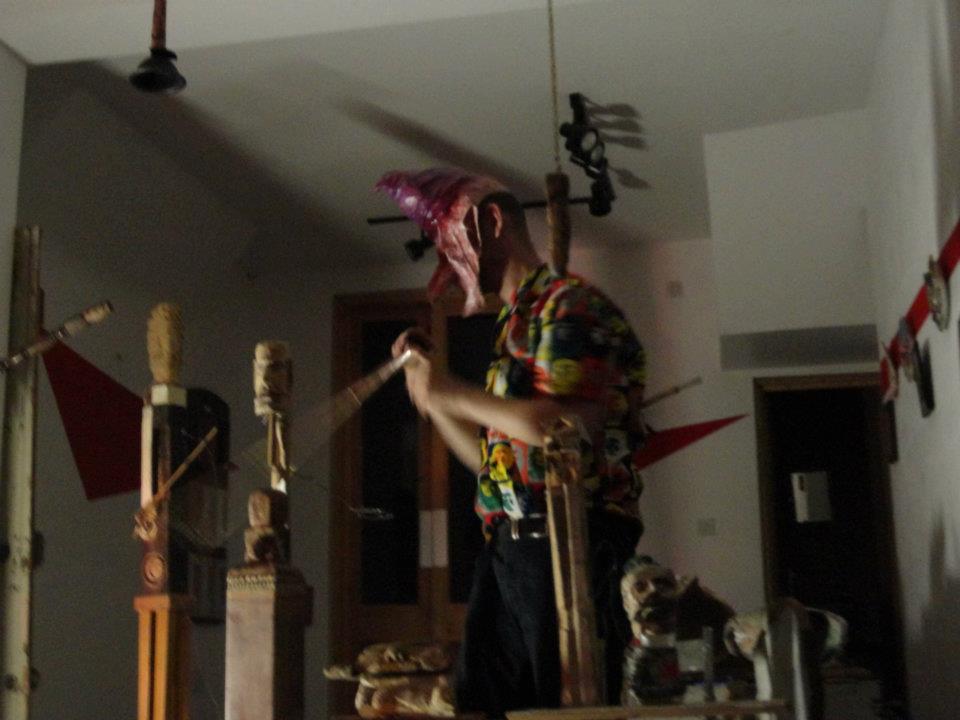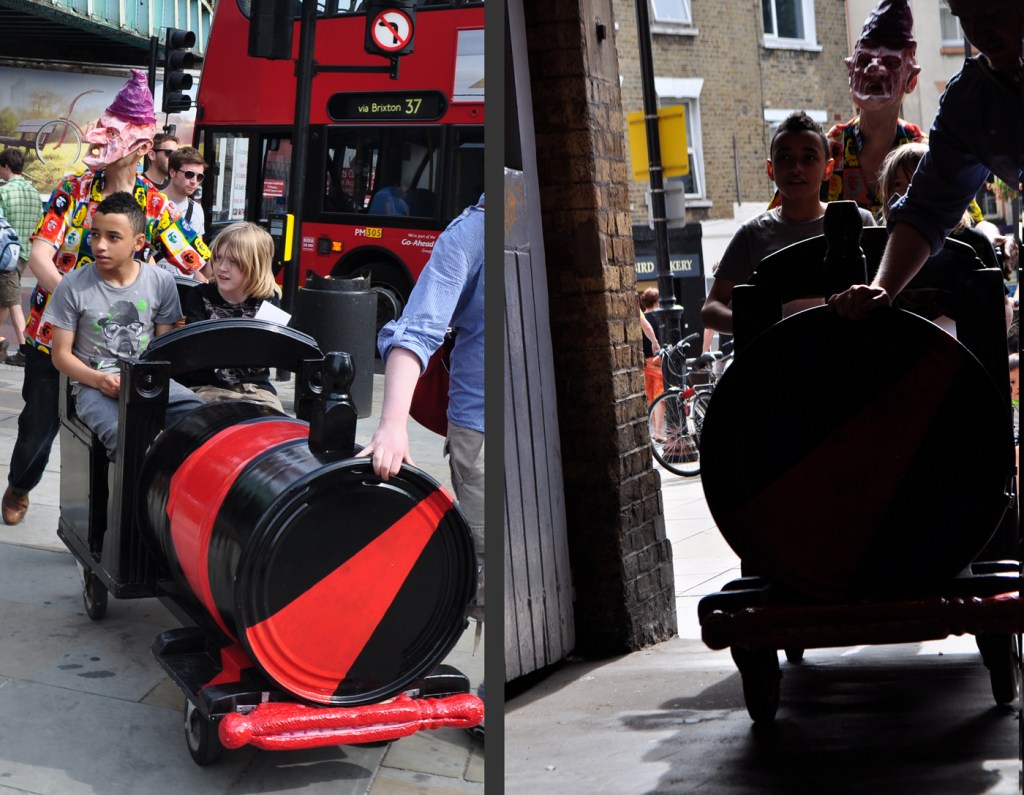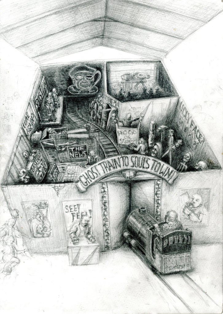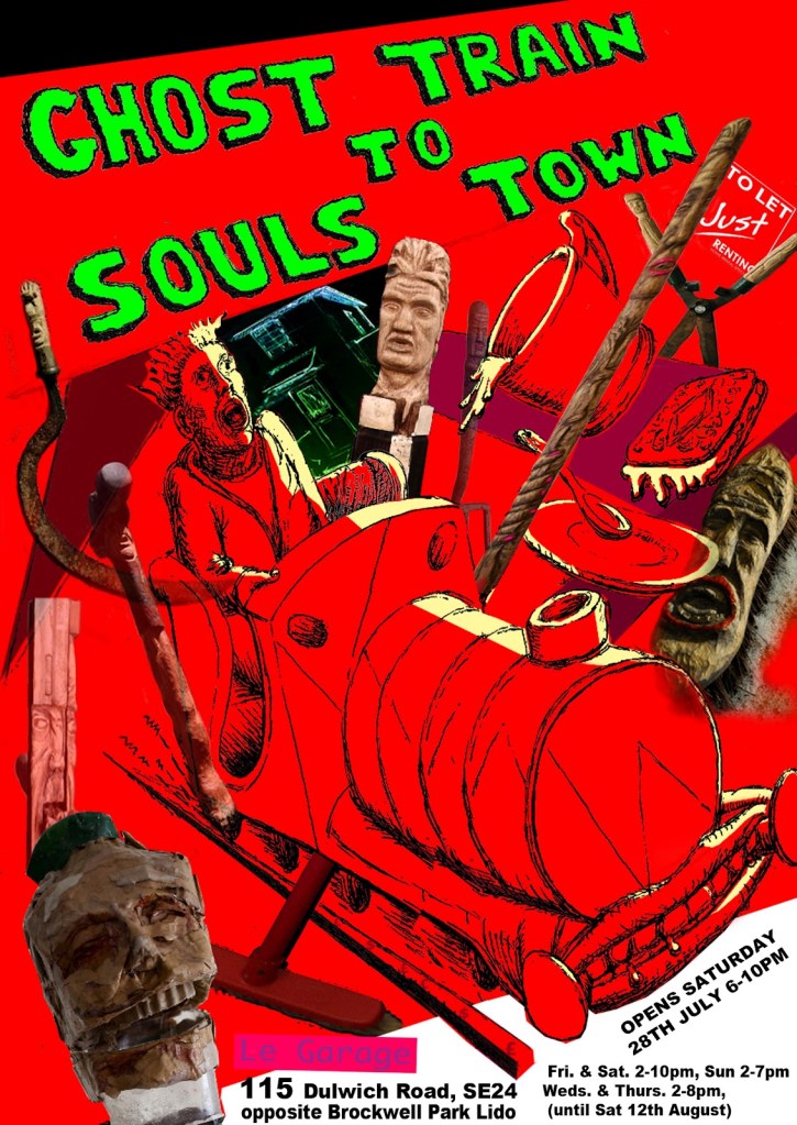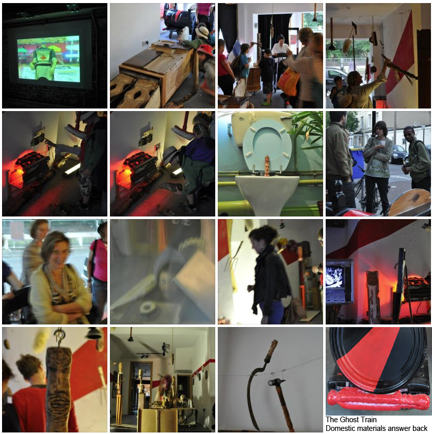 A working ghost train in which people were wheeled into a space containing many carved tools and domestic fragments and a film in which they came alive. You can view the film here-click on link THOSE WHOSE SOULS RESIST REPOSSESSION